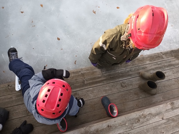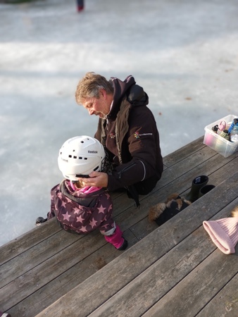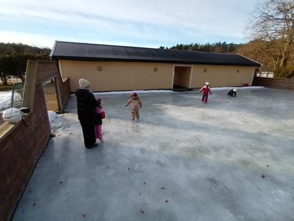 Vi er så heldige at vi har både egen isflate, skøyter og hjelmer. Barna koser seg masse på isen, tiltross for både knall og fall. Det ligger masse mestring i det å falle, reise seg opp og kjenne på det å ikke gi seg! Vinteraktiviteter er helt topp :-)