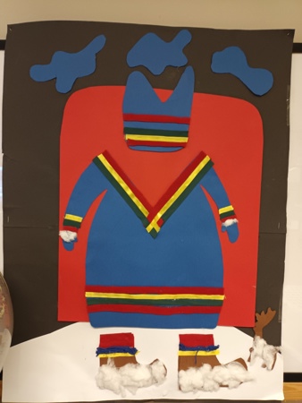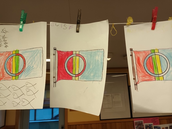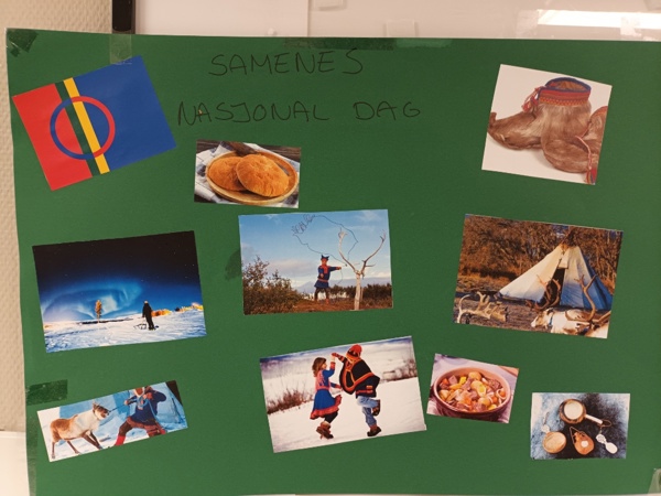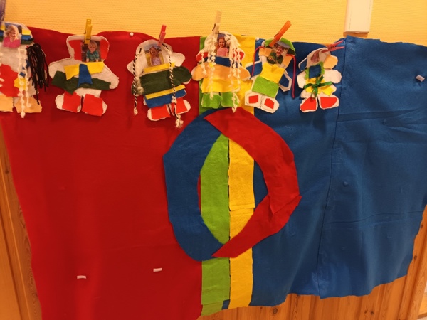 Vi markerer denne dagen gjennom hele uka med å fargelegge det samiske flagget, lage seg selv i samiske drakter, høre på joik, se på film og bilder og lage samisk mat.