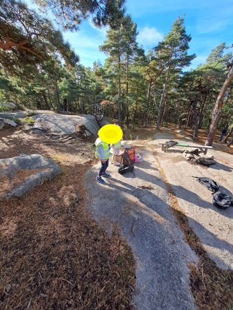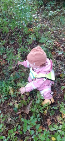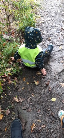 Vi finner mange skatter på tur, kvister, kongler, barkebiter som er båter... og mange fine insekter
