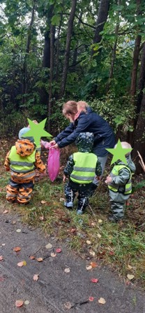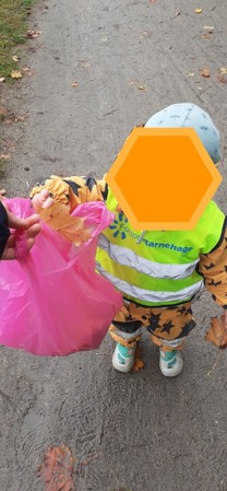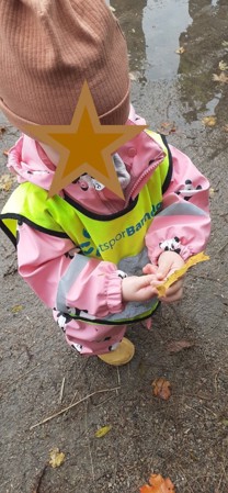 Barna tar med høst løv for å bruke til aktiviteter i barnehagen