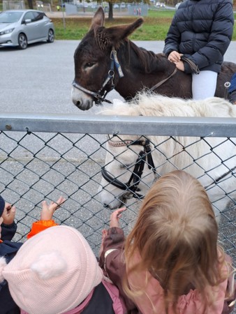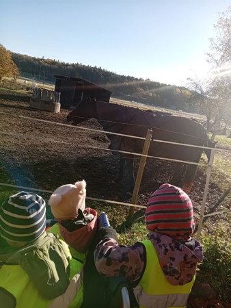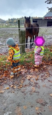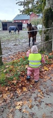 Barna er godt i gang med å utforske sitt nærmiljø, de finner stadig nye veier å gå, og de vil aller helst gå bort til hestene hver gang :-)