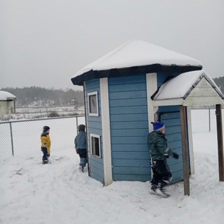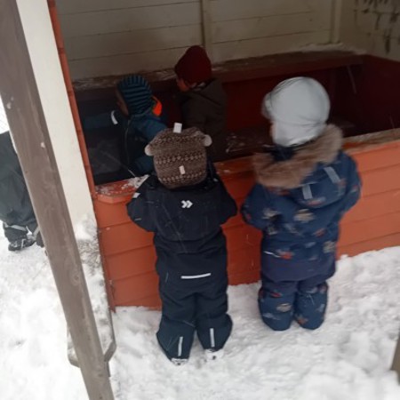 I skrivende stund laver snøen ned, men dessverre blir snøen bløtere og bløtere! Snøen går nok over i regn og vi får masse vann! Skal vi tro på værmeldingen, blir det kaldere igjen allerede i natt, så husk å ferdes forsiktig ute, det blir nok såpeglatt!! Her i barnehagen er vi basert på å være mye ute, og etterstreber å gi barna gode opplevelser selvom været kan være ganske rufsete. Vi snakker mye om hvilken type klær vi bør ha, hva skjer med kalde fingre når vi kommer inn i varmen igjen tro? Selvom vi er mye ute, gir vi også gode opplevelser ved å være inne i varmen, god lek, samlinger med mye sang og eventyr og masse tid til å bare være sammen :-)