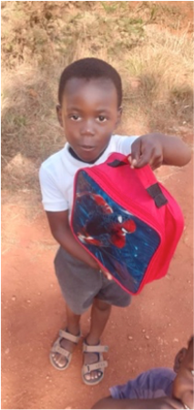 Her er en stolt gutt med ny sekk til førskolen. Tibokalisso elsker førskolen, han må kjøre buss og gleder seg hver dag. Det er ikke som i Norge da, her er det ingen sikring.